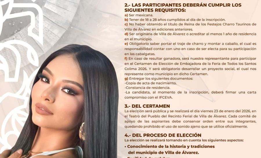 Villa de Álvarez, Col.- El Ayuntamiento de Villa de Álvarez, a través del Patronato de Festejos Charrotaurinos de Villa de Álvarez, emitieron la Convocatoria para el Certamen de Elección de la Reina de los Festejos Charrotaurinos Villa de Álvarez 2026.