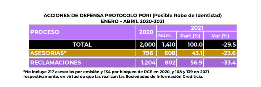 Al mes de abril las acciones de defensa para atender un posible robo de identidad ascendieron a mil 410, de las cuales 608 fueron asesorías y 802 se concretaron como reclamaciones (el 57% del total). En los primeros cuatro meses de 2021, las reclamaciones por un posible robo de identidad mostraron una reducción de 33.4%, respecto de igual periodo del año anterior.