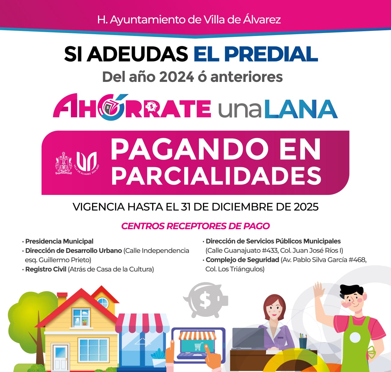 VILLA DE ÁLVAREZ.- El Ayuntamiento de Villa de Álvarez ofrece diversos incentivos fiscales para las y los contribuyentes del municipio, entre otros, el pago en parcialidades del Impuesto Predial a quienes adeuden el año 2024 ó anteriores.