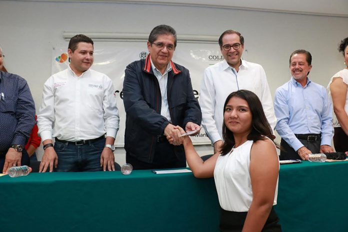 Este jueves se entregaron 39 becas de inscripción y titulación a estudiantes del campus Manzanillo, en ceremonia encabezada por el gobernador Ignacio Peralta Sánchez y el rector José Eduardo Hernández Nava, quienes estuvieron acompañados por Arturo Velasco Villa, miembro del Comité de Becas de la Fundación Ucol, quien asistió en representación de Francisco Zaragoza, presidente de este organismo.