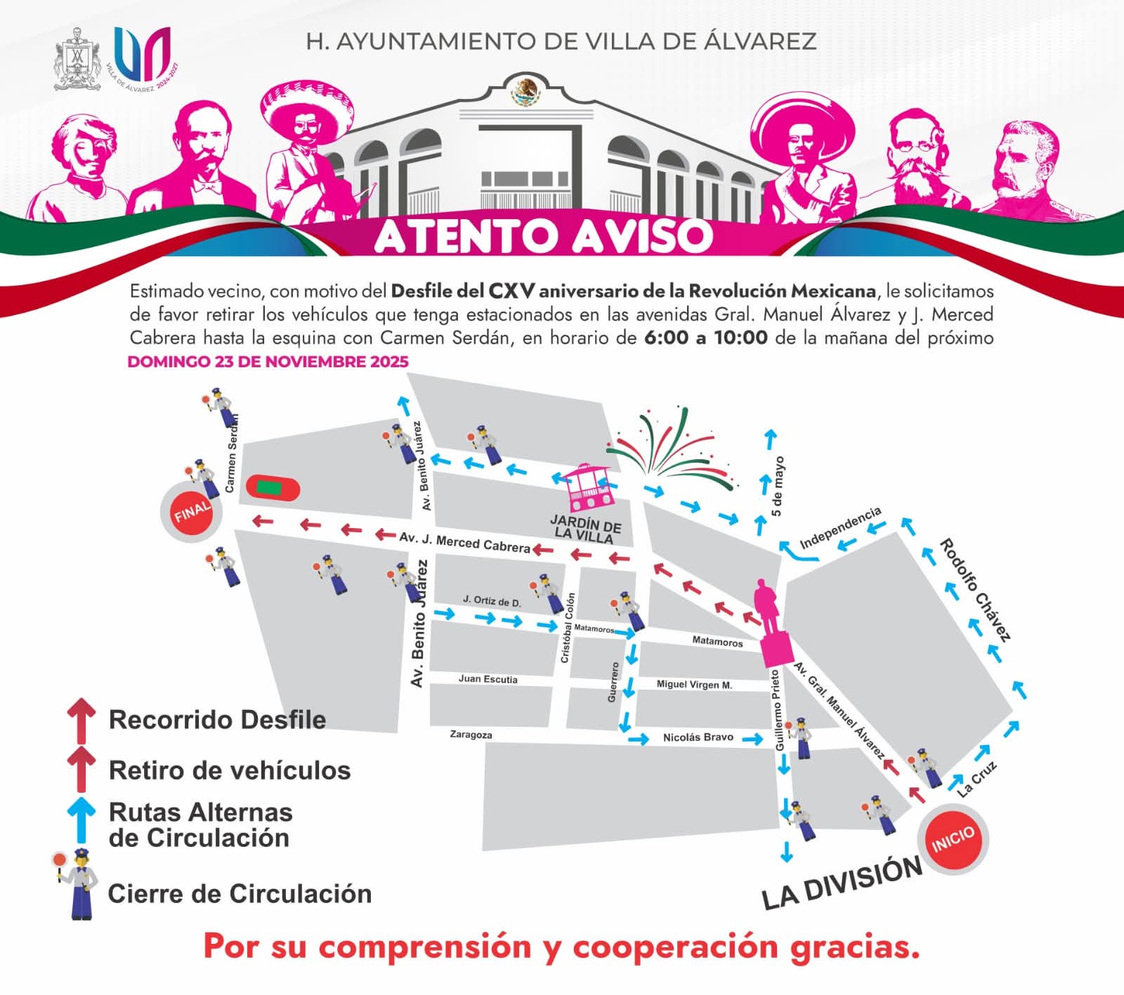 Por la celebración del desfile, las avenidas General Manuel Álvarez y J. Merced Cabrera, hasta llegar a la calle Carmen Serdán, estarán cerradas a la circulación vial desde las 6:00 hasta las 10:00 de la mañana, por lo que además se pide a la población no estacionarse en esas vialidades desde las 6 de la mañana.
