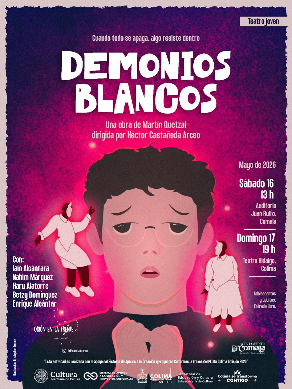 COLIMA.- La compañía Orión en la Frente estrenará la obra ‘Demonios Blancos’, resultante del proyecto de Érick Iaín Alcántara, beneficiario en la categoría Adolescentes Creadores – Nuevos Talentos del Programa de Estímulos a la Creación y Desarrollo Artístico (PECDA), otorgado por la Secretaría de Cultura del Gobierno de México y la Subsecretaría de Cultura del Gobierno del Estado de Colima.