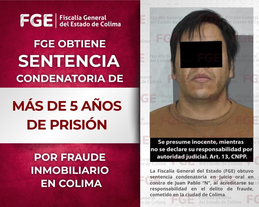 COLIMA.- La Fiscalía General del Estado (FGE) obtuvo sentencia condenatoria en juicio oral en contra de Juan Pablo “N”, al acreditarse su responsabilidad en el delito de fraude, cometido en la ciudad de Colima.