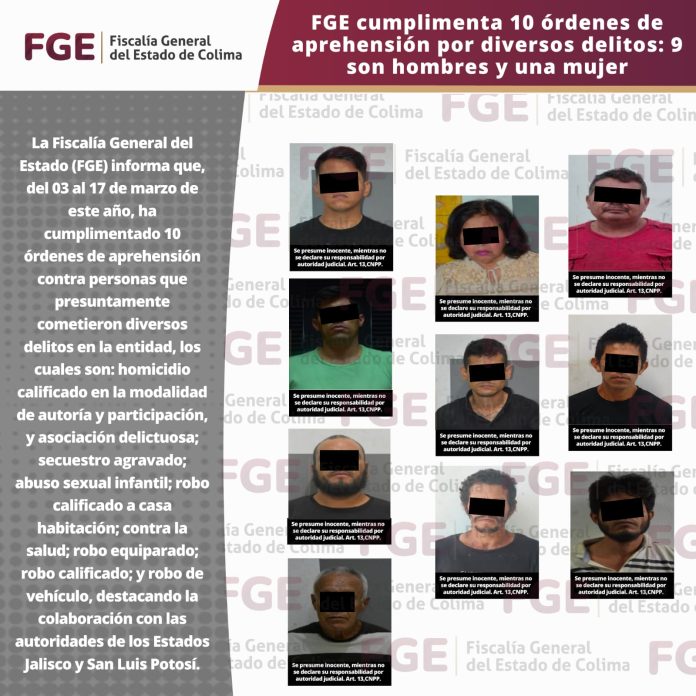 COLIMA.- La Fiscalía General del Estado (FGE) informa que, del 03 al 17 de marzo de este año, ha cumplimentado 10 órdenes de aprehensión contra personas que presuntamente cometieron diversos delitos en la entidad, los cuales son: homicidio calificado en la modalidad de autoría y participación, y asociación delictuosa; secuestro agravado; abuso sexual infantil; robo calificado a casa habitación; contra la salud; robo equiparado; robo calificado; y robo de vehículo, destacando la colaboración con las autoridades de los Estados de Jalisco y San Luis Potosí.