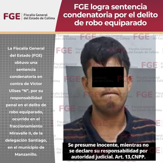 COLIMA.- La Fiscalía General del Estado (FGE) obtuvo una sentencia condenatoria en contra de Víctor Ulises “N”, por su responsabilidad penal en el delito de robo equiparado, ocurrido en el fraccionamiento Miravalle II, de la delegación Santiago, en el municipio de Manzanillo.
