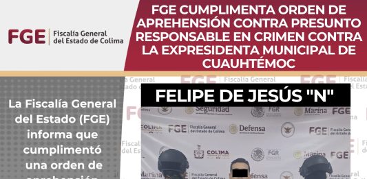 Colima.- La Fiscalía General del Estado (FGE) informa mediante un comunicado oficial este domingo que cumplimentó una orden de aprehensión en contra de una persona presuntamente responsable en homicidio de la expresidenta municipal de Cuauhtémoc, Gabriela Mejía Martínez. AFmedios informó desde el pasado 17 de octubre que tras diversas consultas con fuentes cercanas a seguridad … Sigue leyendo Fiscalía de Colima informa este domingo la detención de presunto responsable del asesinato de Gaby Mejía