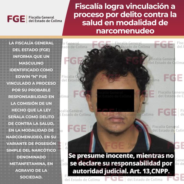 COLIMA.- La Fiscalía General del Estado (FGE) informa que un masculino identificado como Edwin “N” fue vinculado a proceso por su probable responsabilidad en la comisión de un hecho que la ley señala como delito de contra la salud, en la modalidad de narcomenudeo, en su variante de posesión simple del narcótico denominado metanfetamina, en agravio de la sociedad.