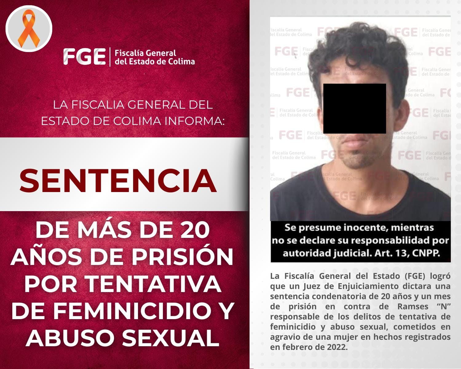 COLIMA.- La Fiscalía General del Estado (FGE) logró que un Juez de Enjuiciamiento dictara una sentencia condenatoria de 20 años y un mes de prisión en contra de Ramses “N” responsable de los delitos de tentativa de feminicidio y abuso sexual, cometidos en agravio de una mujer en hechos registrados en febrero de 2022.