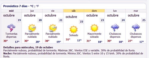 El pronóstico para los siguientes días es de cielos parcialmente nublados y temperaturas que oscilan entre los 30 y 19 grados centígrados.
