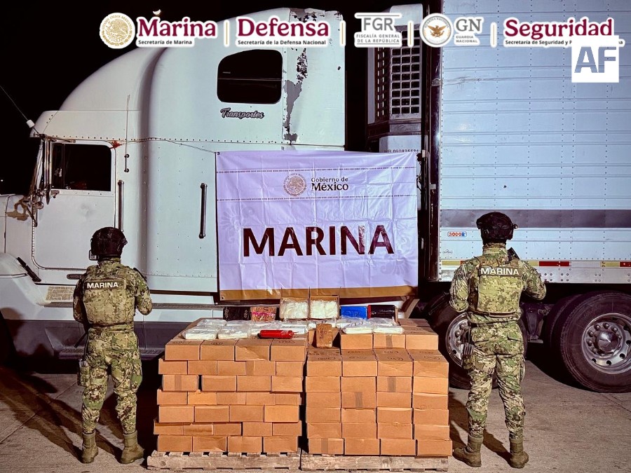 La operación se realizó en el interior del Recinto Portuario de Mazatlán, cuando elementos de la Unidad Naval de Protección Portuaria, durante la inspección a un tractocamión, detuvieron a su conductor, aseguraron 339 cajas que contenían sustancias con características similares a la metanfetamina, con un peso aproximado de 605 kilos y 21 paquetes con posible cocaína, fentanilo y otras sustancias, con un peso estimado de 21 kilos, los cuales venían ocultos en un doble fondo de la unidad de carga.