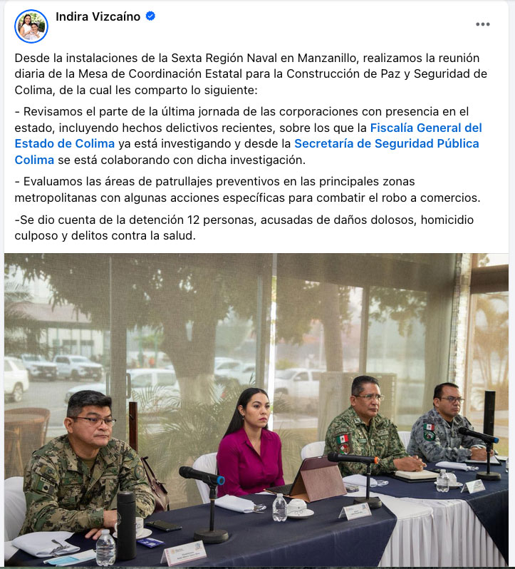 «Revisamos el parte de la última jornada de las corporaciones con presencia en el estado, incluyendo hechos delictivos recientes, sobre los que la Fiscalía General del Estado de Colima ya está investigando y desde la Secretaría de Seguridad Pública Colima se está colaborando con dicha investigación», mencionó la mandataria estatal.
