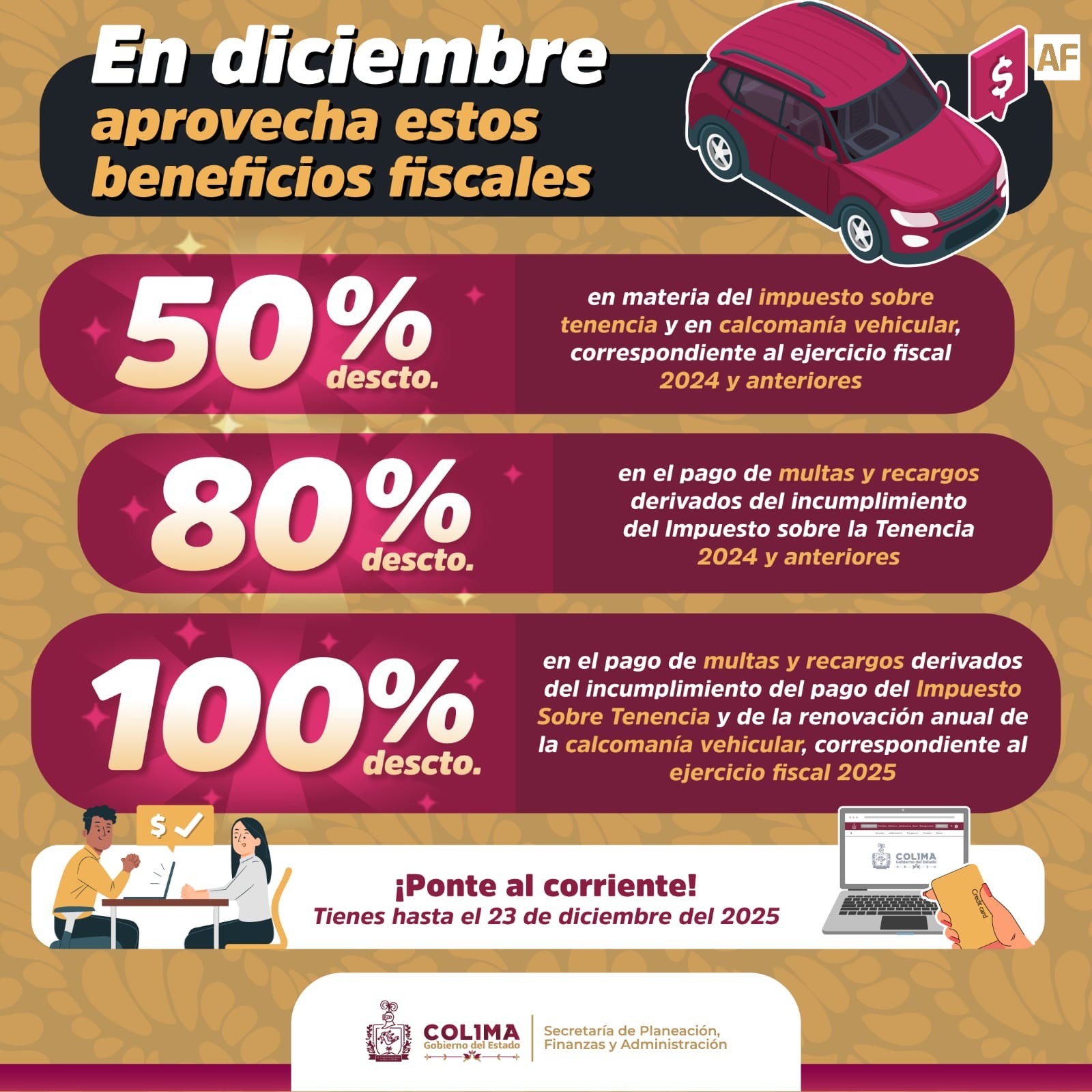 El Gobierno del Estado de Colima, a través de la Secretaría de Planeación, Finanzas y Administración (Seplafina), informa a la ciudadanía que, con el objetivo de apoyar la economía de las familias colimenses y fomentar el cumplimiento de las obligaciones fiscales, se han aprobado una serie de estímulos fiscales dirigidos a personas físicas y morales tenedoras o usuarias de vehículos registrados en el Registro Público Vehicular (Repuve) de esta entidad; dichos beneficios vencen este 23 de diciembre y son los siguientes: