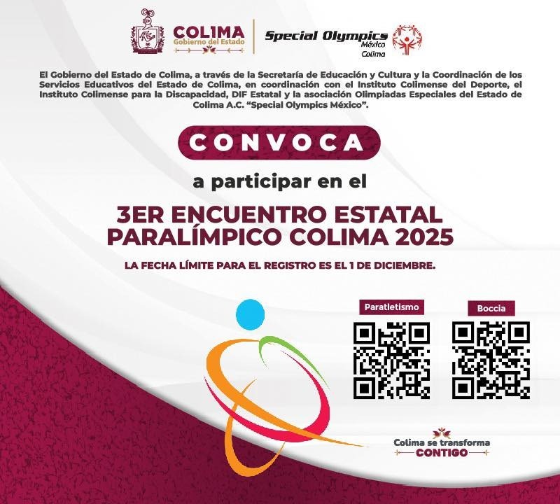 COLIMA.- El Gobierno del Estado de Colima que encabeza la mandataria Indira Vizcaíno Silva, a través de la Secretaría de Educación y Cultura, el Instituto Colimense del Deporte (Incode), Instituto Colimense de la Discapacidad (Incodis), DIF Estatal Colima y la Asociación de Olimpiadas Especiales, invita a participar en el Encuentro Estatal Paralímpico en el marco del Día Internacional de Personas con Discapacidad, que se efectuará el viernes 5 de diciembre a partir de las 8:00 de la mañana, en la pista de la unidad deportiva ‘José María Morelos y Pavón’.