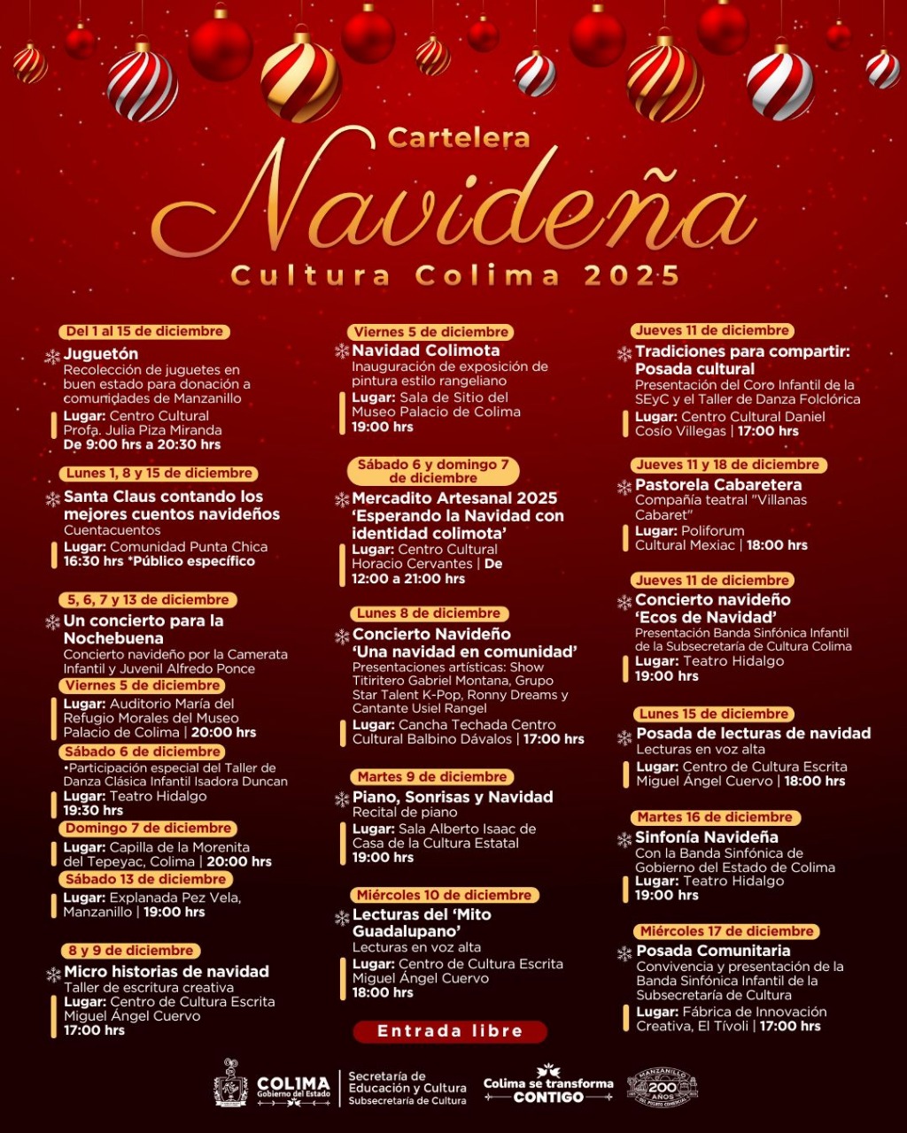 Y entre las más de quince actividades, también destacan el Mercadito Artesanal 2025 que se realizará 5 y 6 de diciembre en el Centro Cultural ‘Horacio Cervantes’, con la participación de más de 35 artesanas y artesanos y el concierto Sinfonía Navideña a cargo de la Banda Sinfónica del Gobierno del Estado de Colima, el martes 16 de diciembre en el Teatro Hidalgo, en el centro histórico de esta ciudad capital.