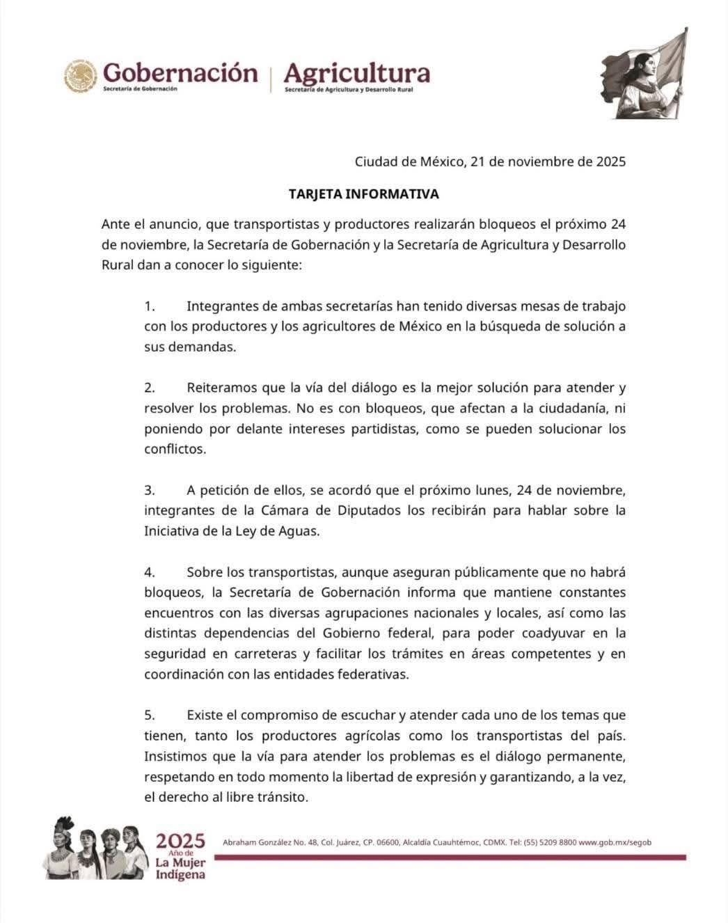 CDMX.- La Secretaría de Gobernación (Segob) y la Secretaría de Agricultura y Desarrollo Rural (SADER) difundieron este 21 de noviembre de 2025 una tarjeta informativa en respuesta al anuncio de posibles bloqueos por parte de productores y transportistas previstos para el próximo lunes 24 de noviembre.