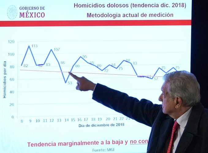“Entonces, en la primera semana consolidamos nuestra información y le fuimos agregando valor. Aquí está la gráfica de tendencia de los homicidios dolosos. Aquí está: el día de antier fueron 64, el día anterior 75, el día previo 66 y así.”
