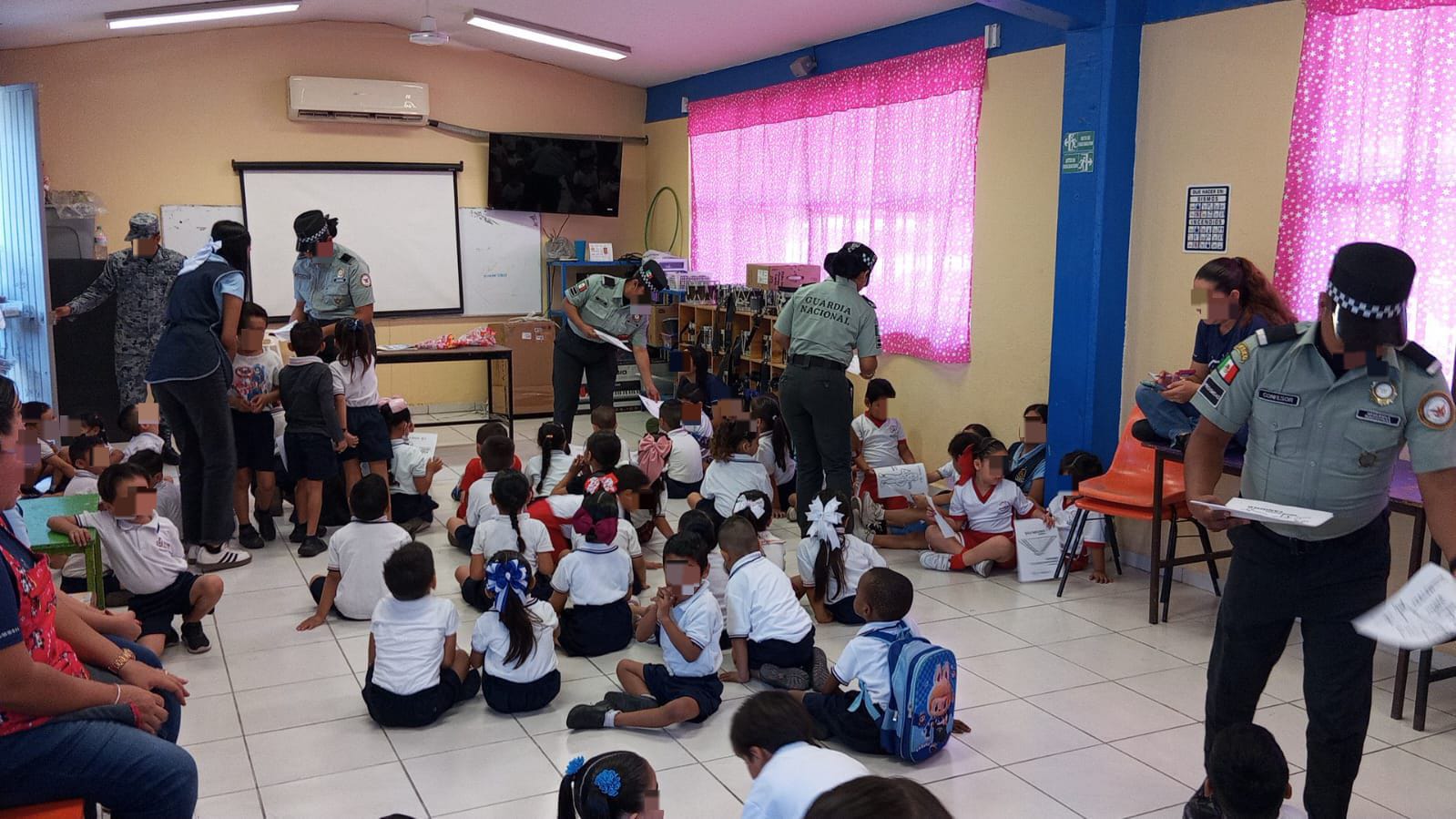 En el municipio de Armería, elementos de esta institución del Gobierno de México acudieron al jardín de niños “María Montessori” en la colonia Linda Vista, donde impartieron pláticas sobre los símbolos patrios, explicando a las y los alumnos el significado de la Bandera Nacional, el Escudo y el Himno Nacional, así como la importancia como emblemas de identidad, unidad y orgullo nacional.