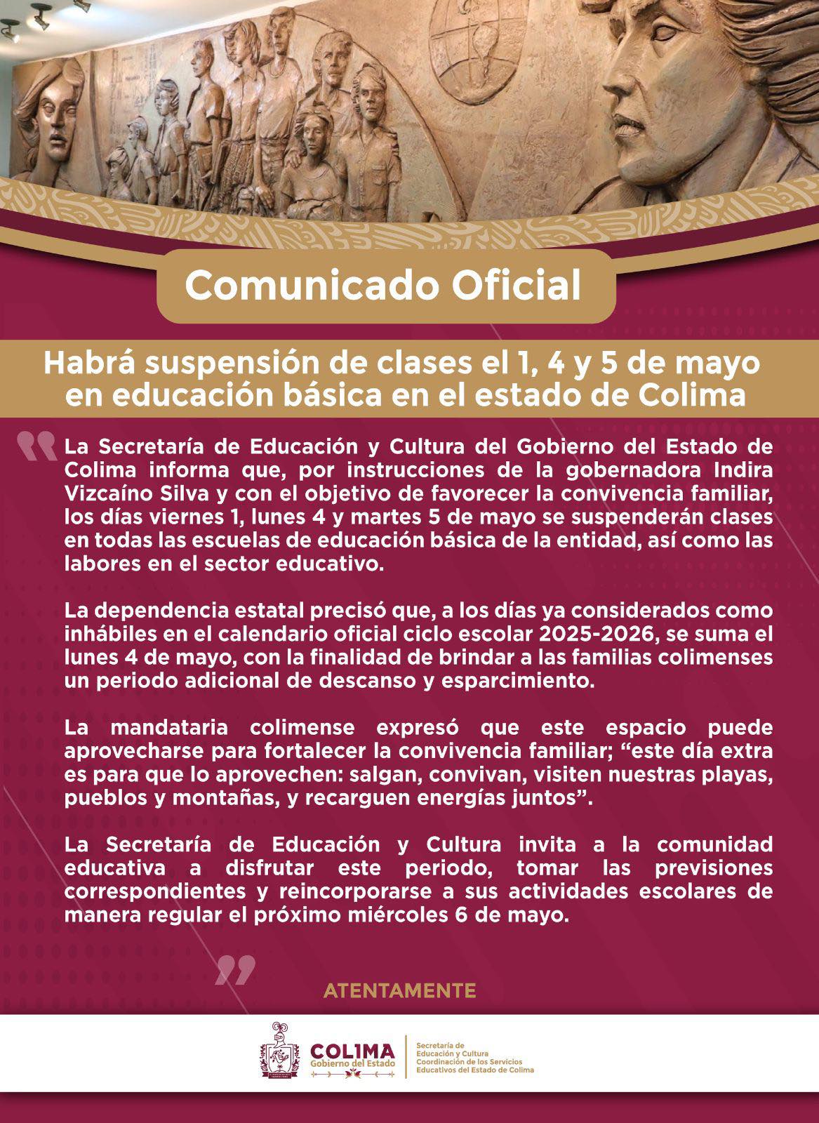 COLIMA.- La Secretaría de Educación y Cultura del Gobierno del Estado de Colima informa que, por instrucciones de la gobernadora Indira Vizcaíno Silva y con el objetivo de favorecer la convivencia familiar, los días viernes 1, lunes 4 y martes 5 de mayo se suspenderán clases en todas las escuelas de educación básica de la entidad, así como las labores en el sector educativo.