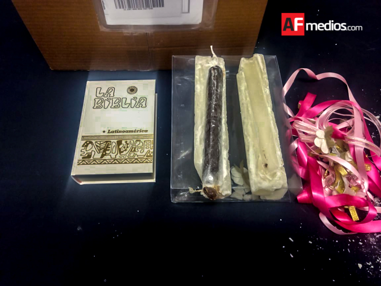 En el interior del paquete, los policías federal localizaron una biblia y una vela dentro de la cual aseguraron una sustancia pastosa color café con las características de la heroína, que un peso aproximado de 90 gramos.