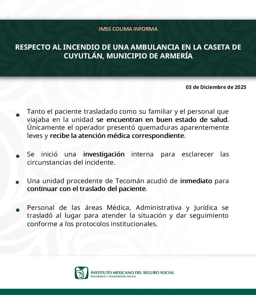 La institución explicó que el incendio se originó durante un traslado programado al Centro Médico Nacional de Occidente (CMNO) y que, tras evacuar la ambulancia, “una unidad procedente de Tecomán acudió de inmediato para continuar con el traslado del paciente”, garantizando la continuidad del servicio.