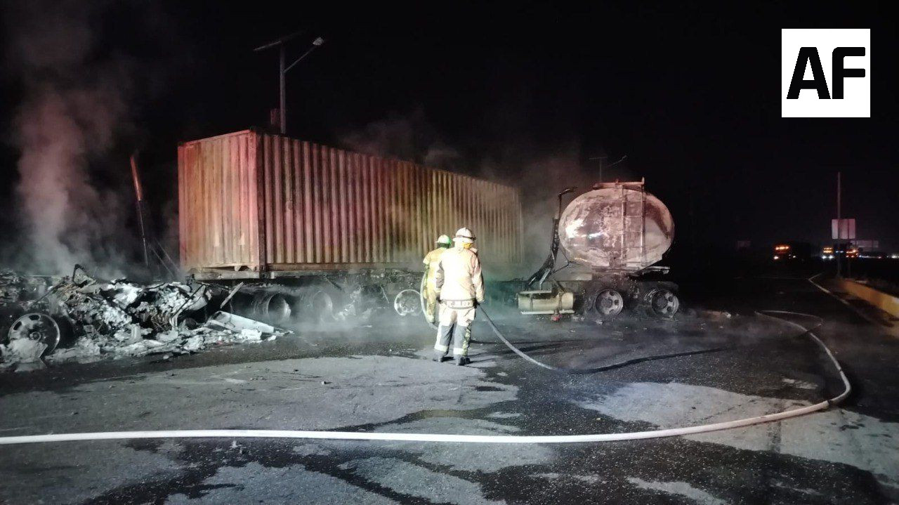 De acuerdo con la información obtenida sobre los hechos ocurridos este sábado 14 de febrero, un tractocamión con contenedor, que se encontraba detenido a un costado de la vía, fue impactado lateralmente por una pipa con capacidad de 40 mil litros; ambas unidades estaban vacías.
