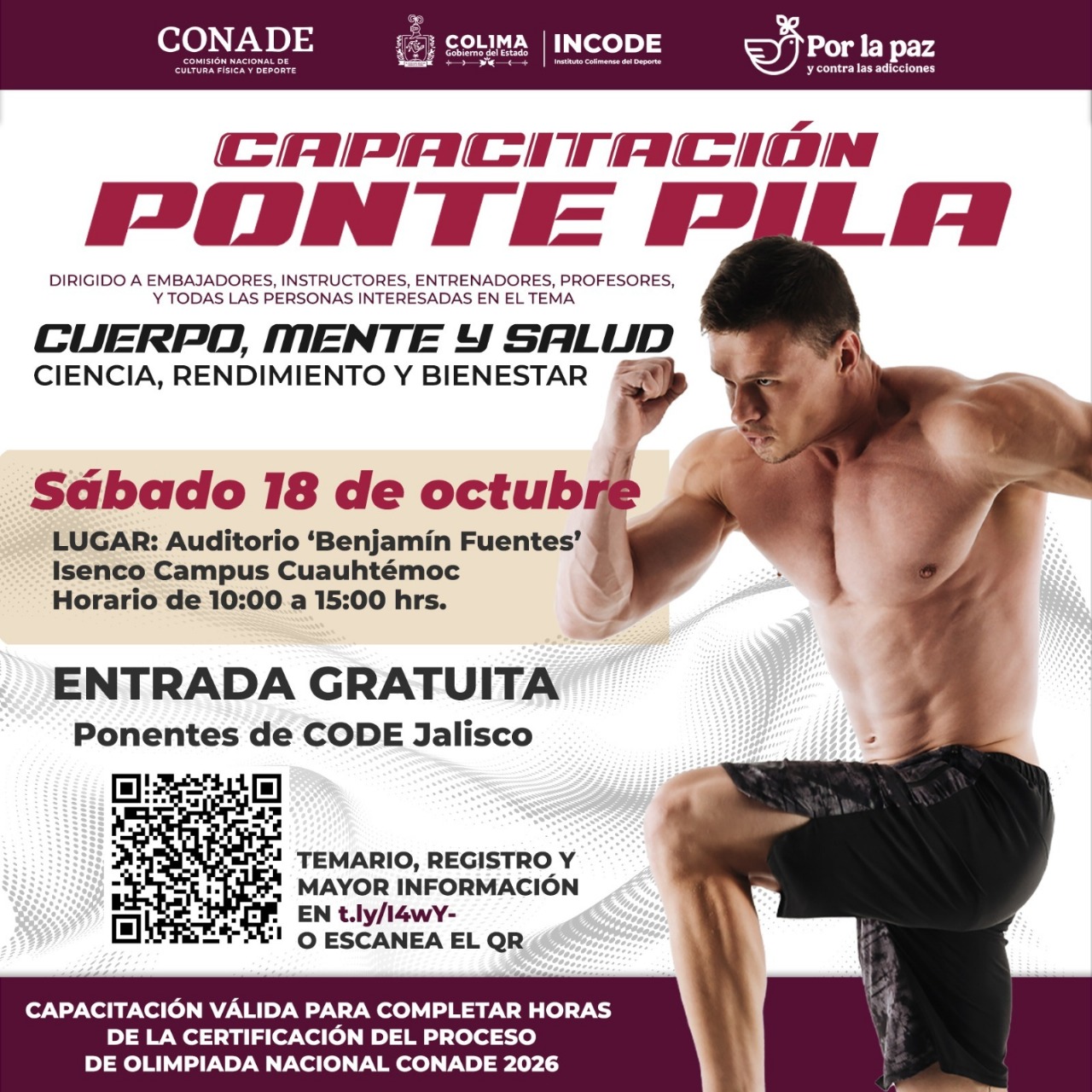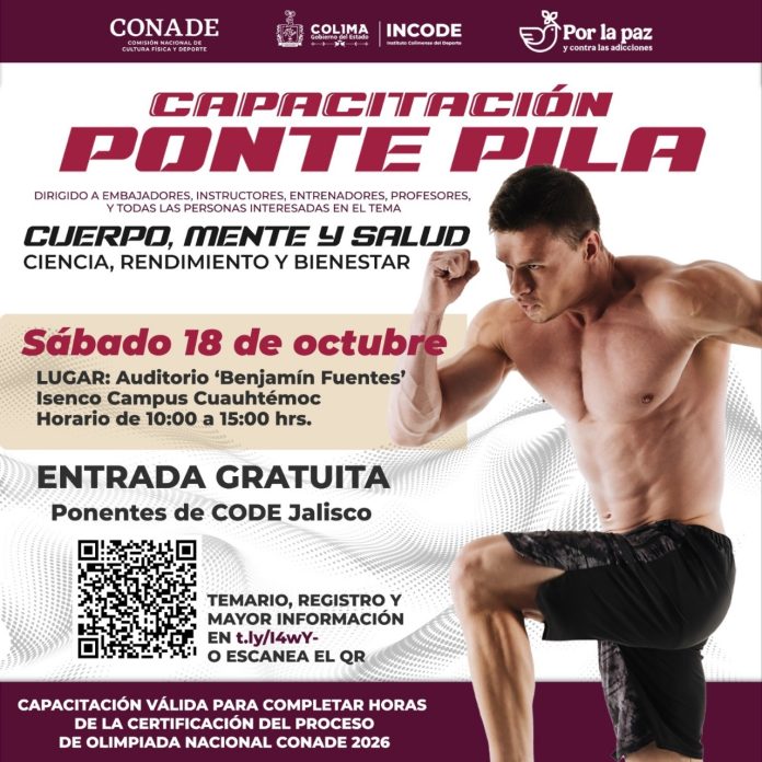 COLIMA.- El Gobierno del Estado de Colima, a través del Instituto Colimense del Deporte (Incode), en coordinación con la Comisión Nacional de Cultura Física y Deporte (Conade) y el Consejo Estatal para el Fomento Deportivo del Estado de Jalisco, invitan a participar en la capacitación ‘Cuerpo, Mente y Salud’ del programa de activación física ‘Ponte Pila’, en el auditorio “Benjamín Fuentes González” del Instituto Superior de Educación Normal del Estado de Colima (Isenco) campus Cuauhtémoc, este sábado 18 de octubre, de las 10:00 de la mañana a las 3:00 de la tarde.