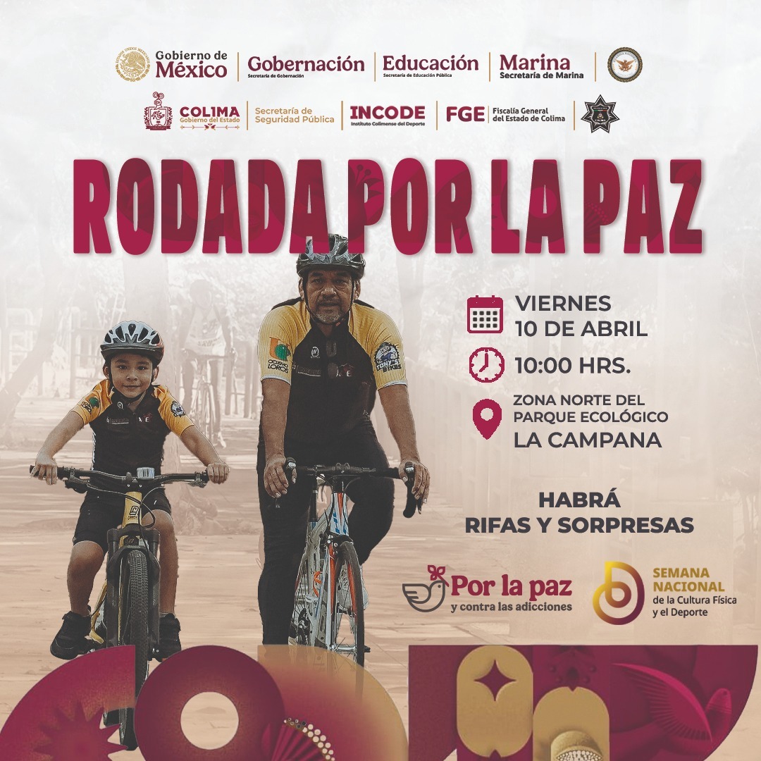 COLIMA.- Este viernes 10 de abril, en el marco del Día Internacional del Deporte para el Desarrollo y la Paz, el Gobierno del Estado de Colima realizará la Rodada por la Paz, por lo que el Instituto Colimense del Deporte invita a participar en este evento familiar que se efectuará a partir de las 10:00 de la mañana por los senderos del parque ecológico ‘La Campana’, iniciando en el ingreso norte de esta área natural protegida ubicada en la zona conurbada de Colima y Villa de Álvarez.