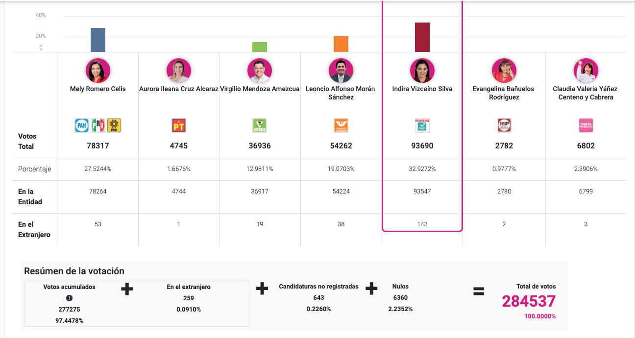 Vizcaíno Silva obtuvo 93 mil 690 votos totales en la entidad y en el extranjero, mientras que su más cercana contendiente, Mely Romero Celis de la Coalición Va por Colima, obtuvo 78 mil 317 votos totales, con una diferencia marcada entre ambos de 15 mil 373 votos.