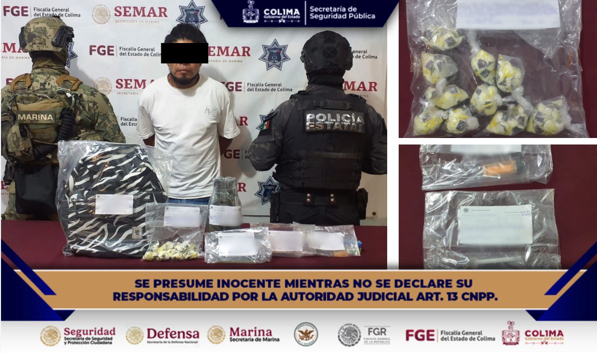 COLIMA.- La Secretaría de Seguridad Pública (SSP) del Gobierno del Estado de Colima informa que, como parte de los trabajos operativos que se realizan de manera coordinada entre las corporaciones federales, estatales y municipales, se llevan a cabo patrullajes en los diez municipios, que derivaron en la detención de un hombre por su probable participación en delitos contra la salud, en Villa de Álvarez.
