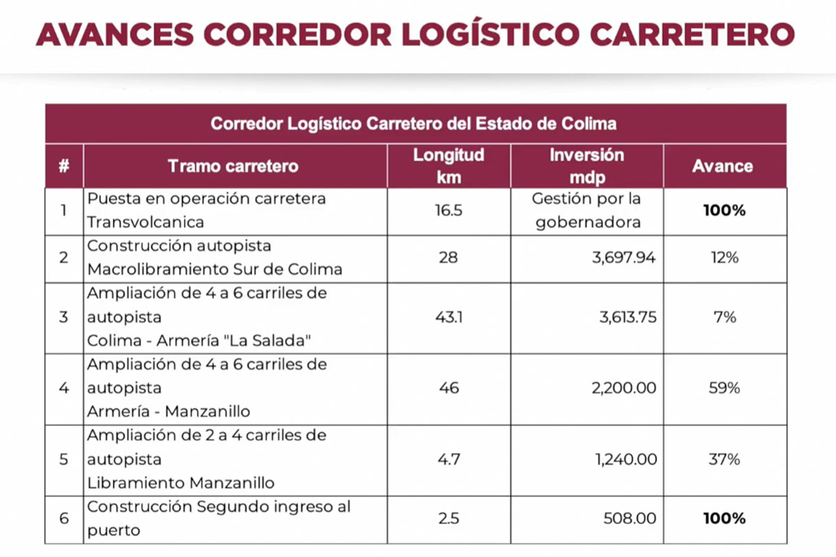 Asimismo, se informó que el segundo ingreso al puerto de Manzanillo ya se encuentra en operación, mientras que la modernización del libramiento de Manzanillo, que pasará de dos a cuatro carriles en un tramo de 4.7 kilómetros, presenta avances con una inversión estimada de mil 240 millones de pesos.