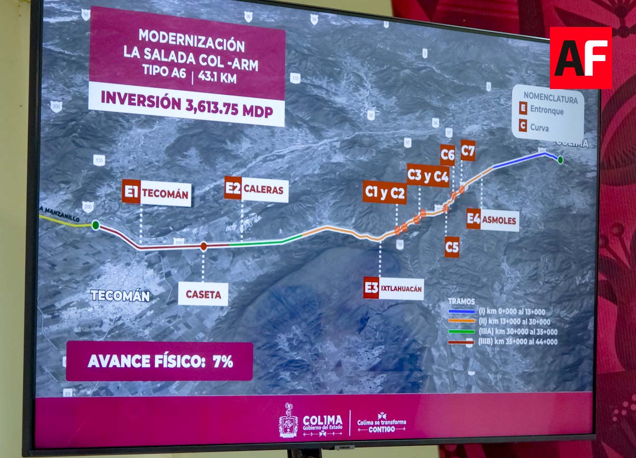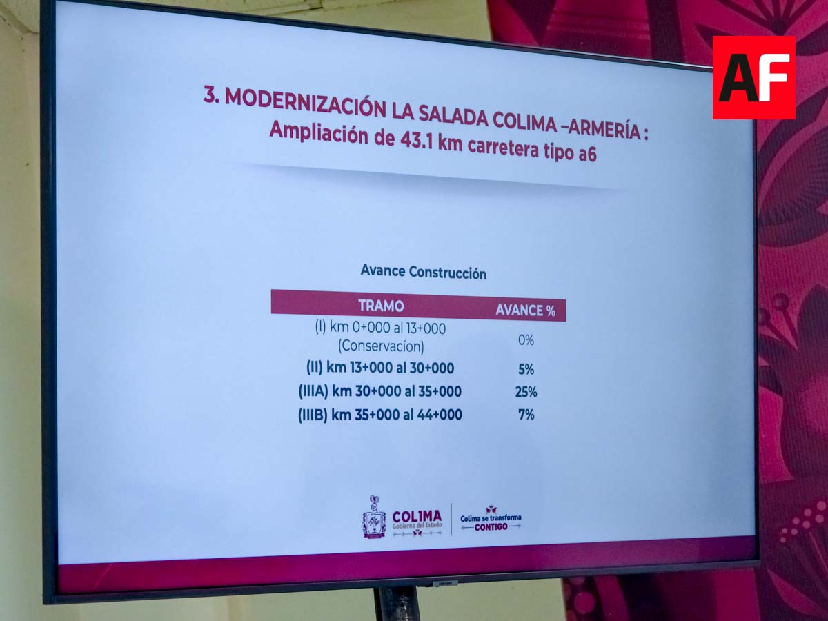 Respecto a la ampliación de la autopista Colima–Armería, en el tramo conocido como La Salada, se informó un avance físico del 7 por ciento.