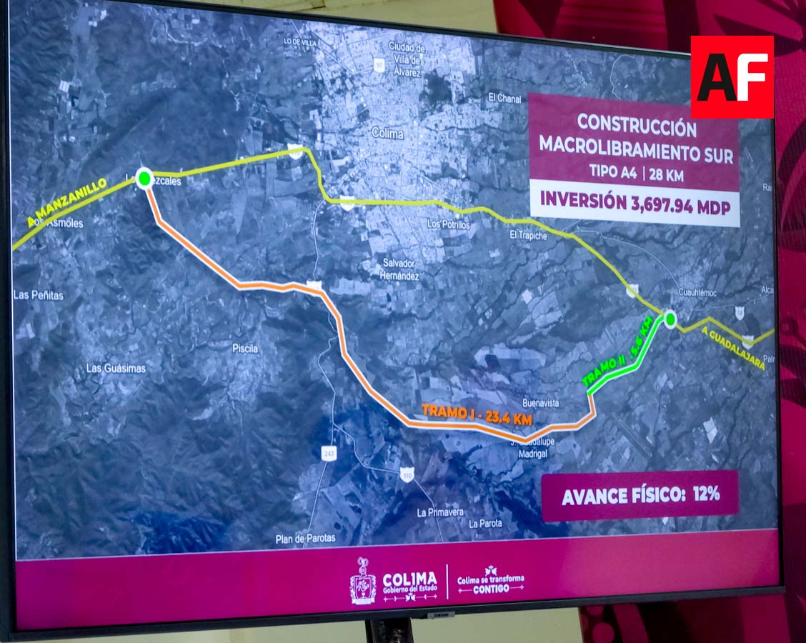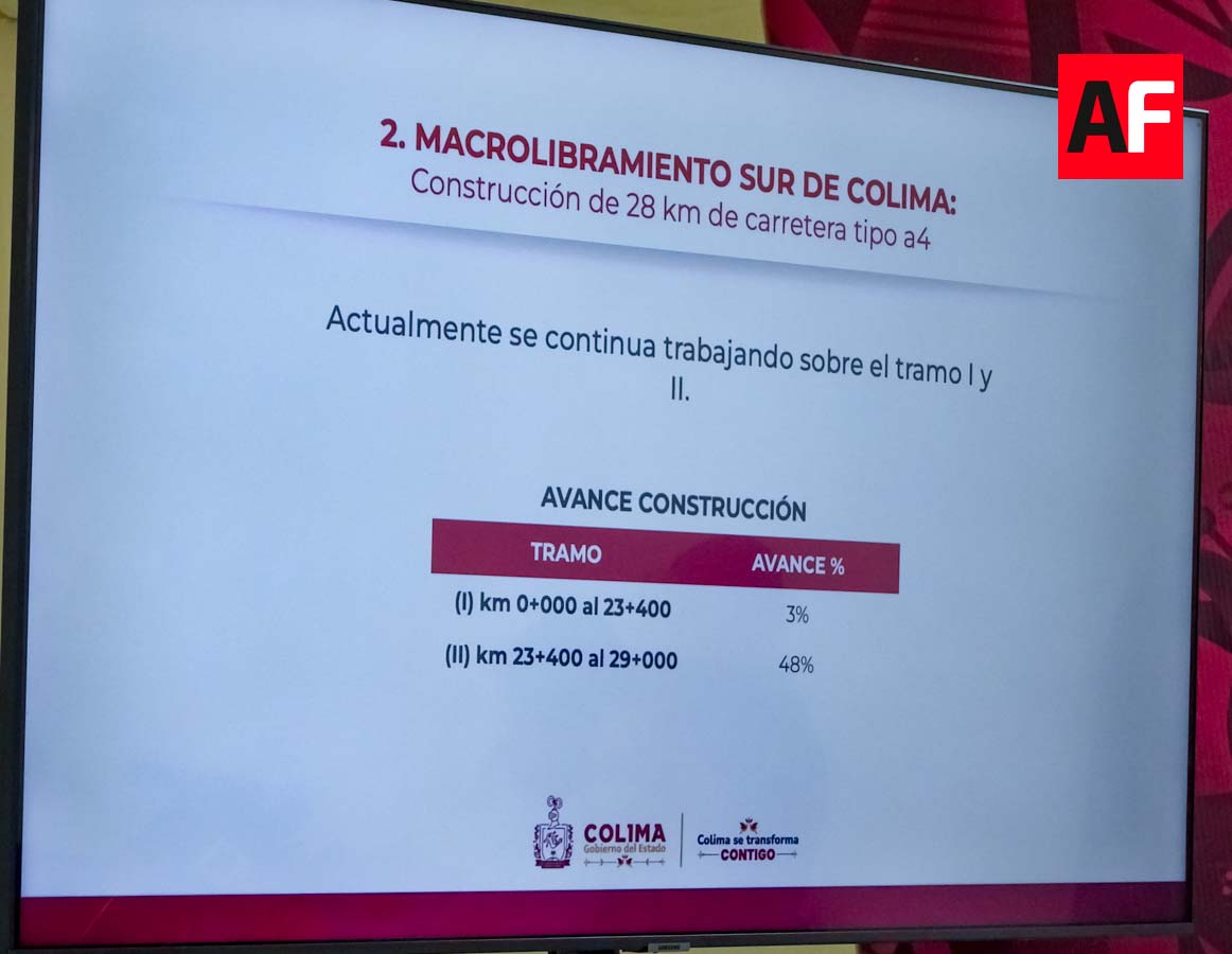 En cuanto al macrolibramiento sur de Colima, con una longitud total de 28 kilómetros, se reporta un avance general del 12 por ciento. Esta obra representa una inversión de 3 mil 697 millones de pesos y se divide en dos tramos: uno de ampliación de una vía existente y otro de nueva construcción en una zona que anteriormente no contaba con infraestructura carretera.