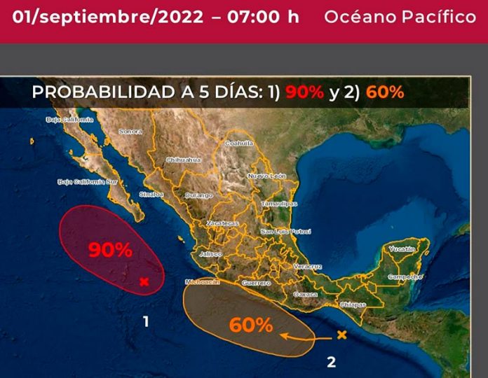 La Comisión Nacional del Agua (Conagua) informó que un canal de baja presión extendido a lo largo de la Sierra Madre Occidental y el ingreso de humedad del Océano Pacífico generado por una zona de baja presión con alta probabilidad para desarrollo ciclónico (o posible ciclón tropical) que se localizará al sur de la Península de Baja California y frente a las costas de Jalisco, producirán lluvias puntuales muy fuertes en Nayarit, Jalisco y Michoacán; y lluvias puntuales fuertes en Colima y Zacatecas.