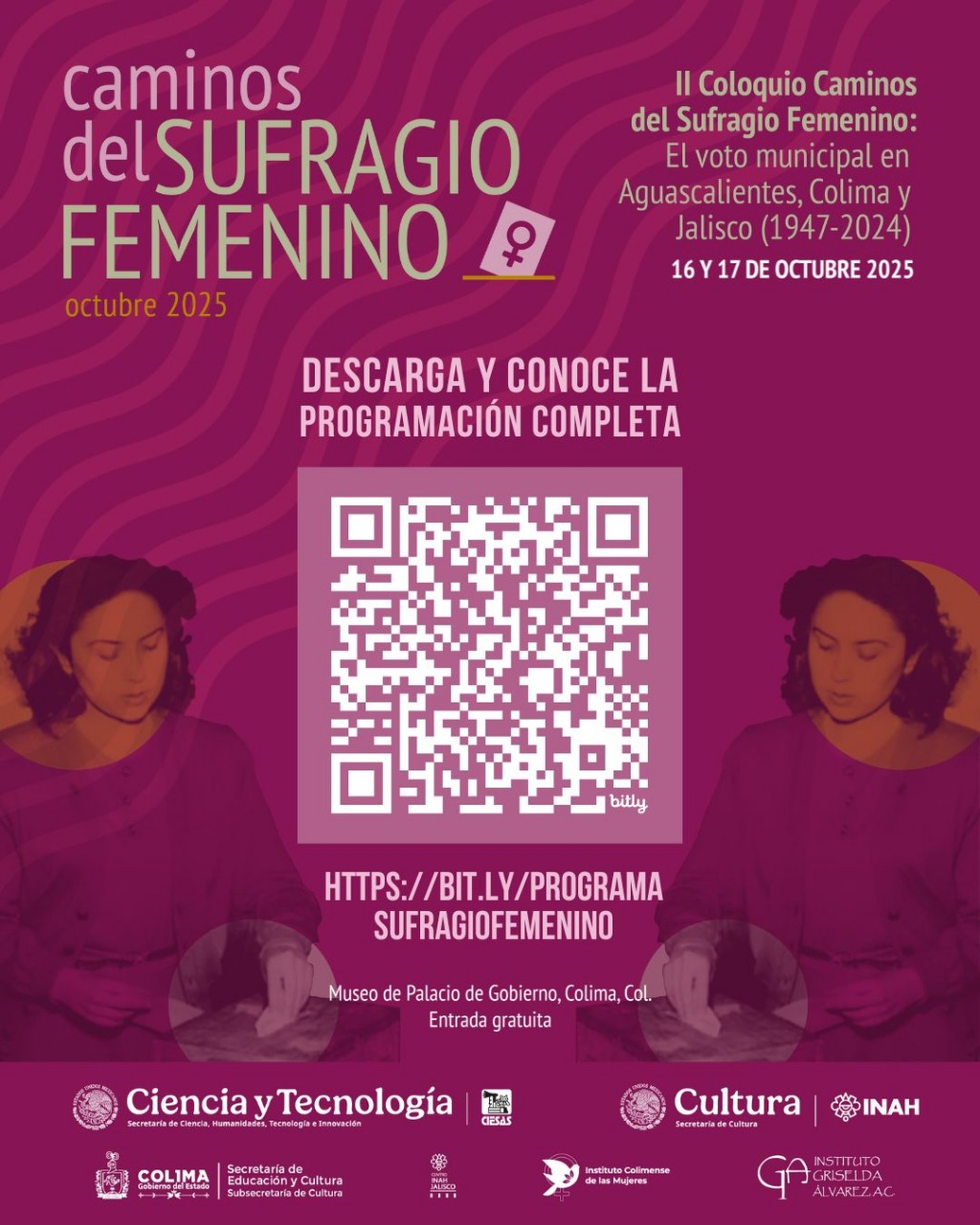 Durante estas dos jornadas, en las que también participará el Instituto Colimense de las Mujeres (ICM) y el Instituto Griselda Álvarez A.C., el público podrá disfrutar de conferencias magistrales, mesas redondas y asistir a la inauguración de la exposición museográfica ‘Caminos del sufragio femenino’, creada en colaboración por el Instituto Nacional de Antropología e Historia (INAH) y la Secretaría de Ciencia, Humanidades, Tecnología e Innovación del Gobierno de México.