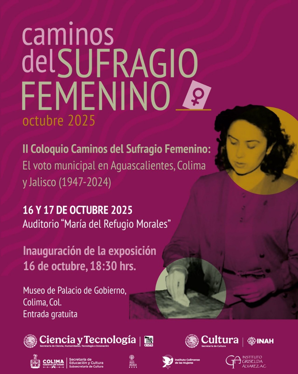 COLIMA.- El Centro de Investigaciones y Estudios Superiores en Antropología Social (CIESAS Occidente), en coordinación con la Subsecretaría de Cultura del Gobierno del Estado de Colima, organizan e invitan al II Coloquio Caminos del Sufragio Femenino: el voto municipal en Aguascalientes, Colima y Jalisco (1947-2024) que se realizará 16 y 17 de octubre en el Museo Palacio de Gobierno, en el marco del 70 aniversario de las primeras elecciones en que participaron las mujeres mexicanas, para conmemorar la lucha por la conquista de este derecho universal.