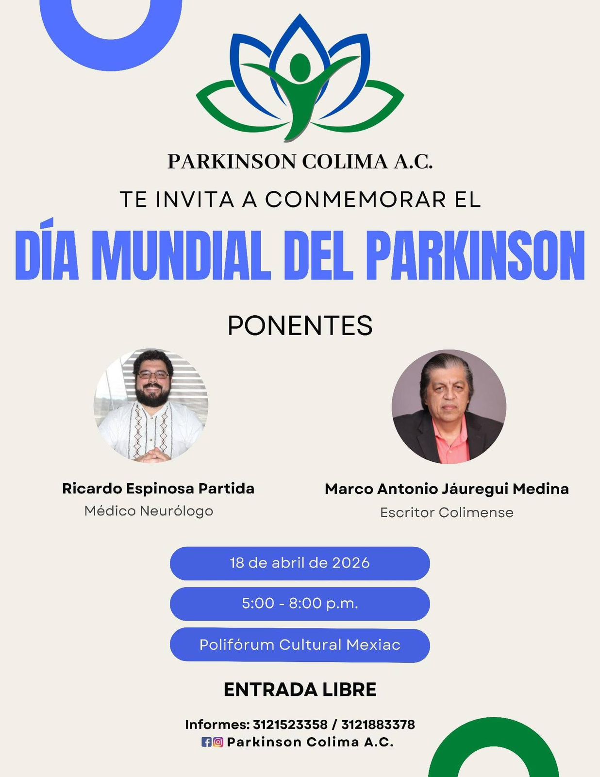La segunda actividad estará encabezada por el escritor colimense Marco Antonio Jáuregui Medina, integrante de la asociación, quien compartirá una charla y lectura de fragmentos de su obra “Parkinson, relatos de una cirugía”, basada en su experiencia tras someterse a una intervención de estimulación cerebral profunda.