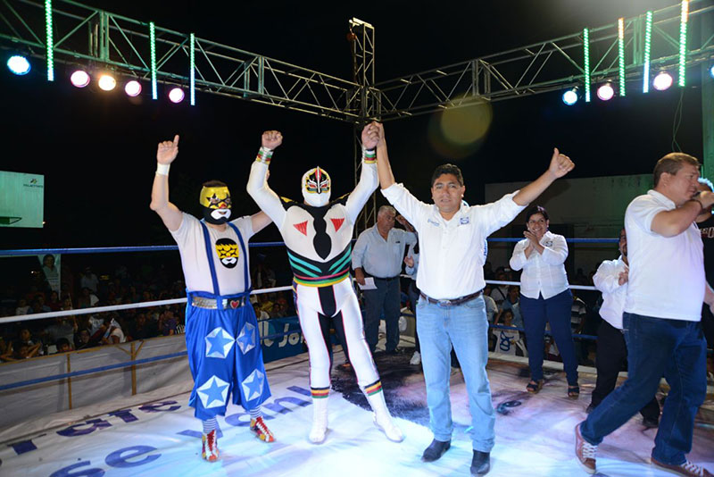 Colima.- Jorge Luis Preciado Rodríguez y el luchador Máscara Sagrada subieron juntos al cuadrilátero. Ante miles de colimenses, el gladiador manifestó que el candidato del Partido Acción Nacional realizará acciones contundentes para no dejar sin empleo a los profesionistas, quienes desde los centros educativos tendrán el suficiente apoyo para culminar sus estudios.