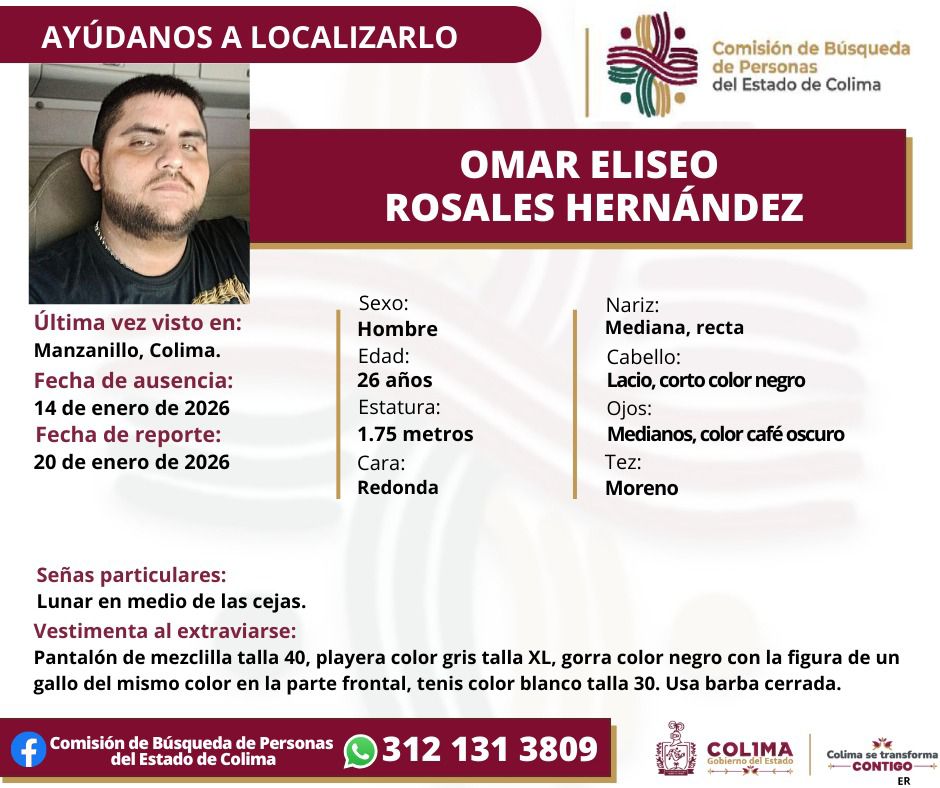 La ficha de búsqueda emitida por la Comisión de Búsqueda de Personas del Estado de Colima describe a Omar Eliseo como un hombre de 1.75 metros, complexión morena, cara redonda y una seña particular: un lunar en medio de las cejas. Al momento de su desaparición, vestía pantalón de mezclilla, playera gris, gorra negra con la figura de un gallo y tenis blancos.