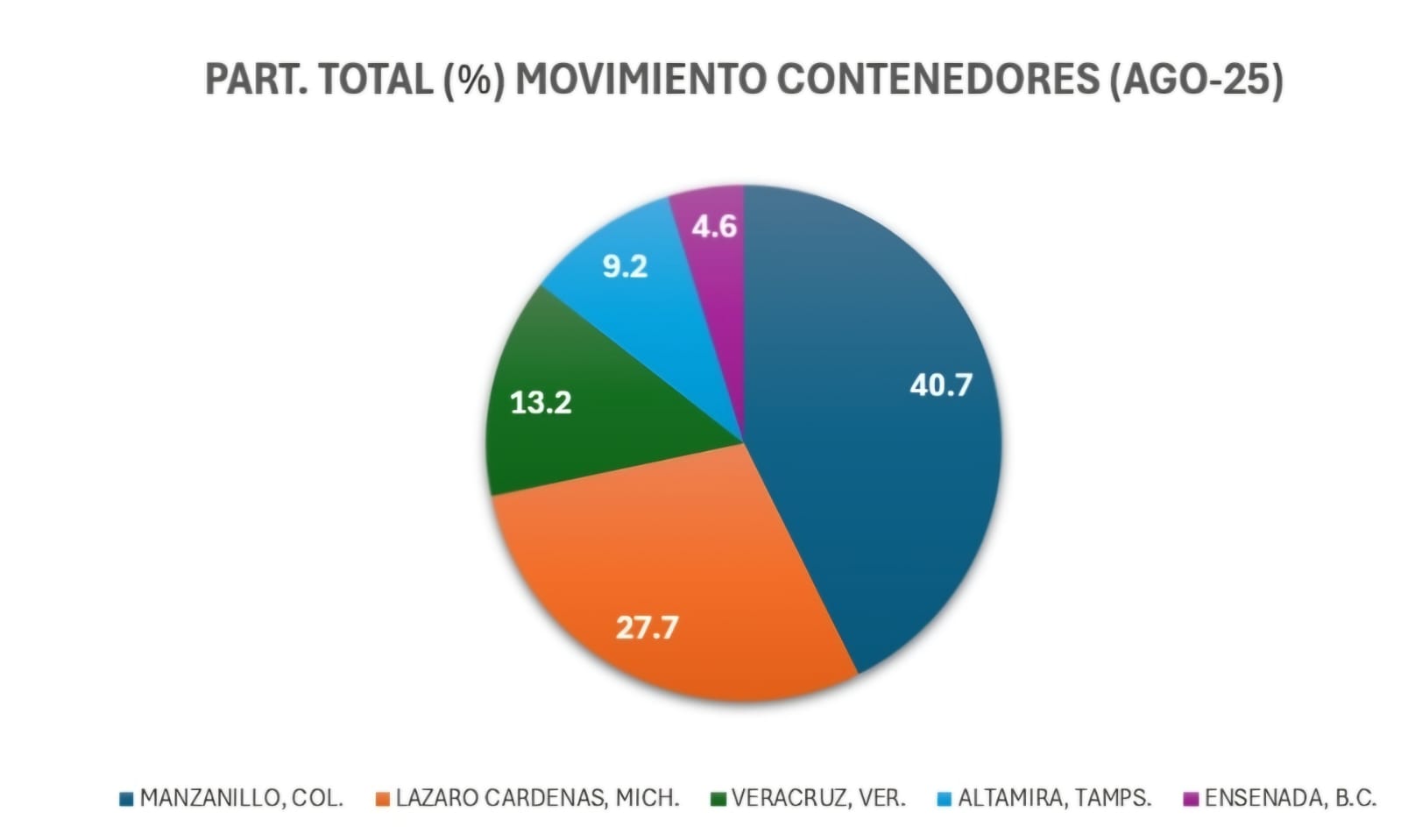 Para los primeros diez meses de 2025, Manzanillo movilizó el 40 por ciento del total nacional de contenedores, superando el 27 por ciento operado por Lázaro Cárdenas, el 13.2 por ciento de Veracruz, el 9.2 por ciento de Altamira y el 4.6 por ciento de Ensenada.