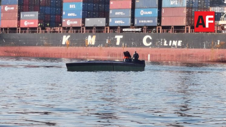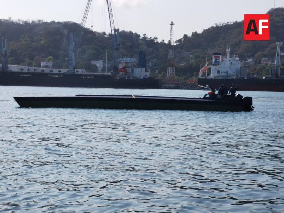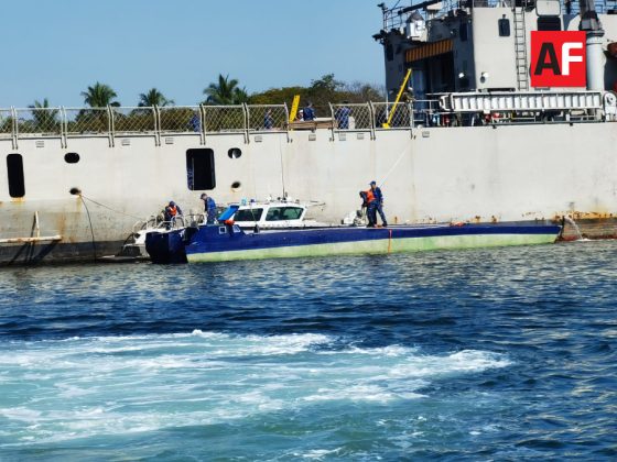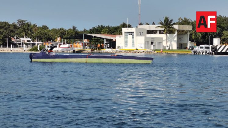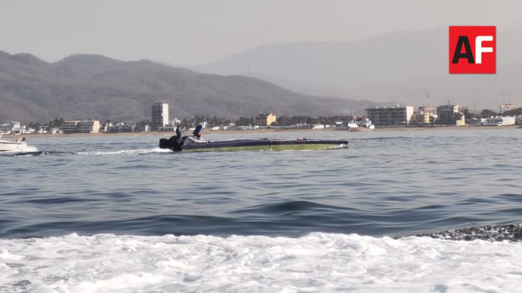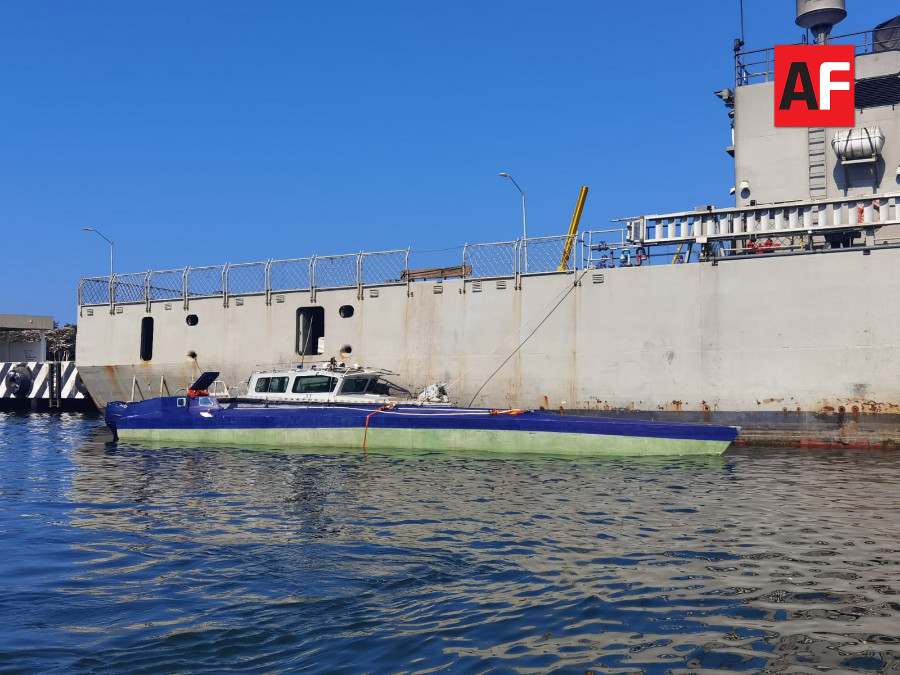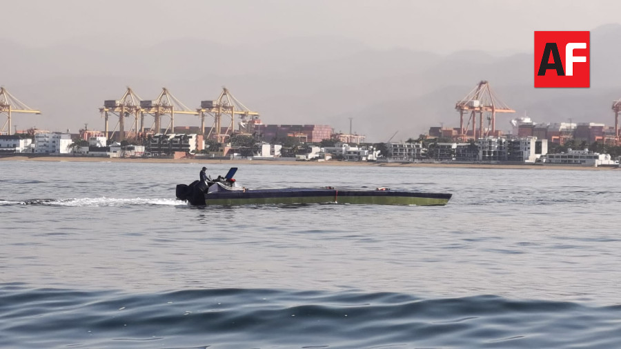 Manzanillo.- Esta mañana de viernes 20 de febrero arribó al puerto de Manzanillo una embarcación de bajo perfil (LPV por sus siglas en inglés) o semisumergible, asegurada en días pasados con presunta sustancias ilícitas en altamar frente a la costa de Colima.