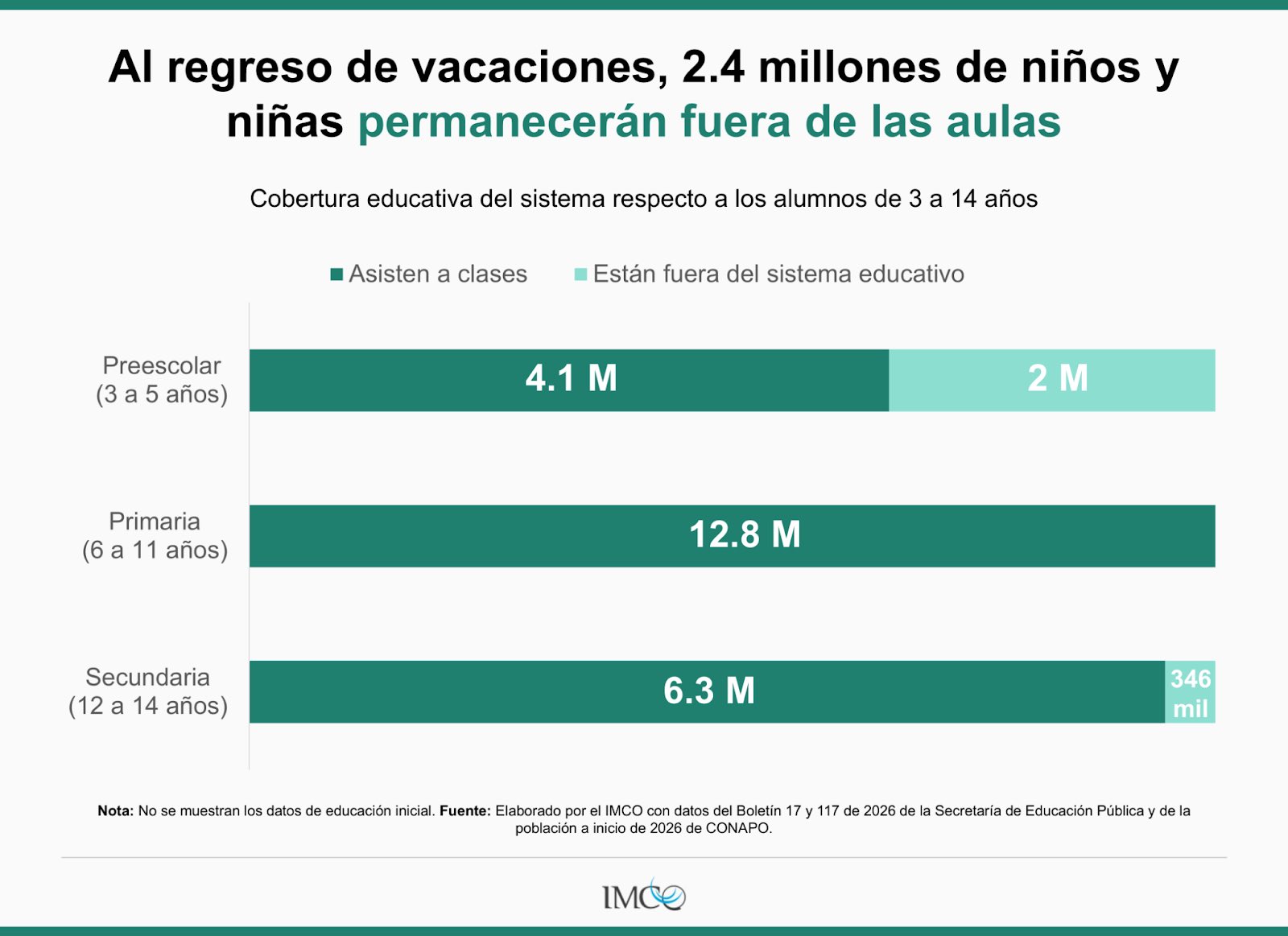 En educación preescolar, alrededor de 2 millones de menores de entre 3 y 5 años no asisten a clases, mientras que en secundaria la cifra alcanza los 346 mil estudiantes fuera de las aulas.