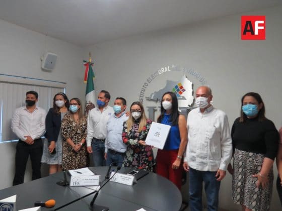 Mely Romero entregó su documentación acompañada de los dirigentes estatales del PRI, Arnoldo Ochoa González; del PAN, Alejandro García Rivera y del PRD, José Alberto Cisneros Salgado.