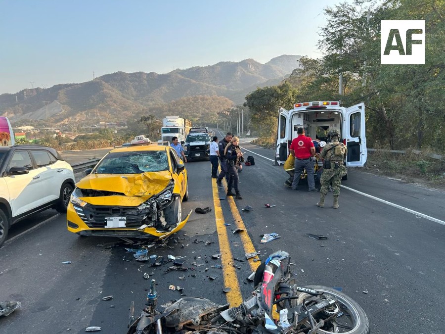 Manzanillo.- La Dirección de Protección Civil y Bomberos Manzanillo atendió un accidente vehicular registrado en la carretera Manzanillo–Colima, a la altura de la conocida caseta vieja, en el que se vieron involucrados una motocicleta y un taxi.