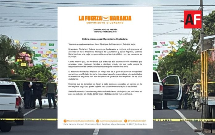 Movimiento Ciudadano advirtió que el asesinato de Mejía es un reflejo de la grave situación que enfrenta el estado, donde la violencia se ha vuelto una constante y las instituciones encargadas de la seguridad han sido incapaces de garantizar la tranquilidad de la ciudadanía.