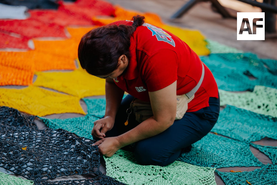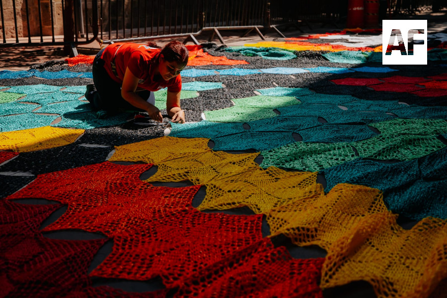 Los diseños del mural se inspiran en patrones geométricos como los hexágonos, conocidos como “el jardín de la abuela”, una idea tradicional que el colectivo adapta con creatividad y color según cada proyecto. La elaboración de estos murales implica un proceso complejo debido al material, pero refleja el compromiso y la pasión de quienes participan en su creación.