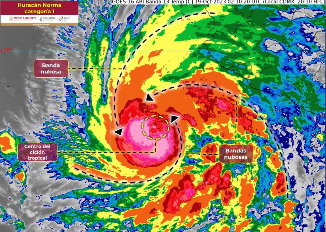 Norma tiene rachas de 185 km/h y se localizó a 485 kilómetros (km) al suroeste de Manzanillo, Colima, y a 750 km al sur-sureste de Cabo San Lucas, Baja California Sur, con desplazamiento hacia el norte a 13 km/h, con dirección hacia Baja California Sur.