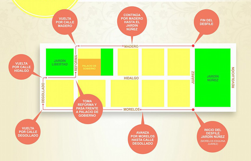 La nueva ruta comenzará en el Jardín Núñez, en el cruce de las calles Morelos y Juárez, seguirá por las calles Morelos, Degollado, Hidalgo (una cuadra), Reforma y Madero, para concluir nuevamente en el Jardín Núñez, en la esquina lateral a la que inició el evento.