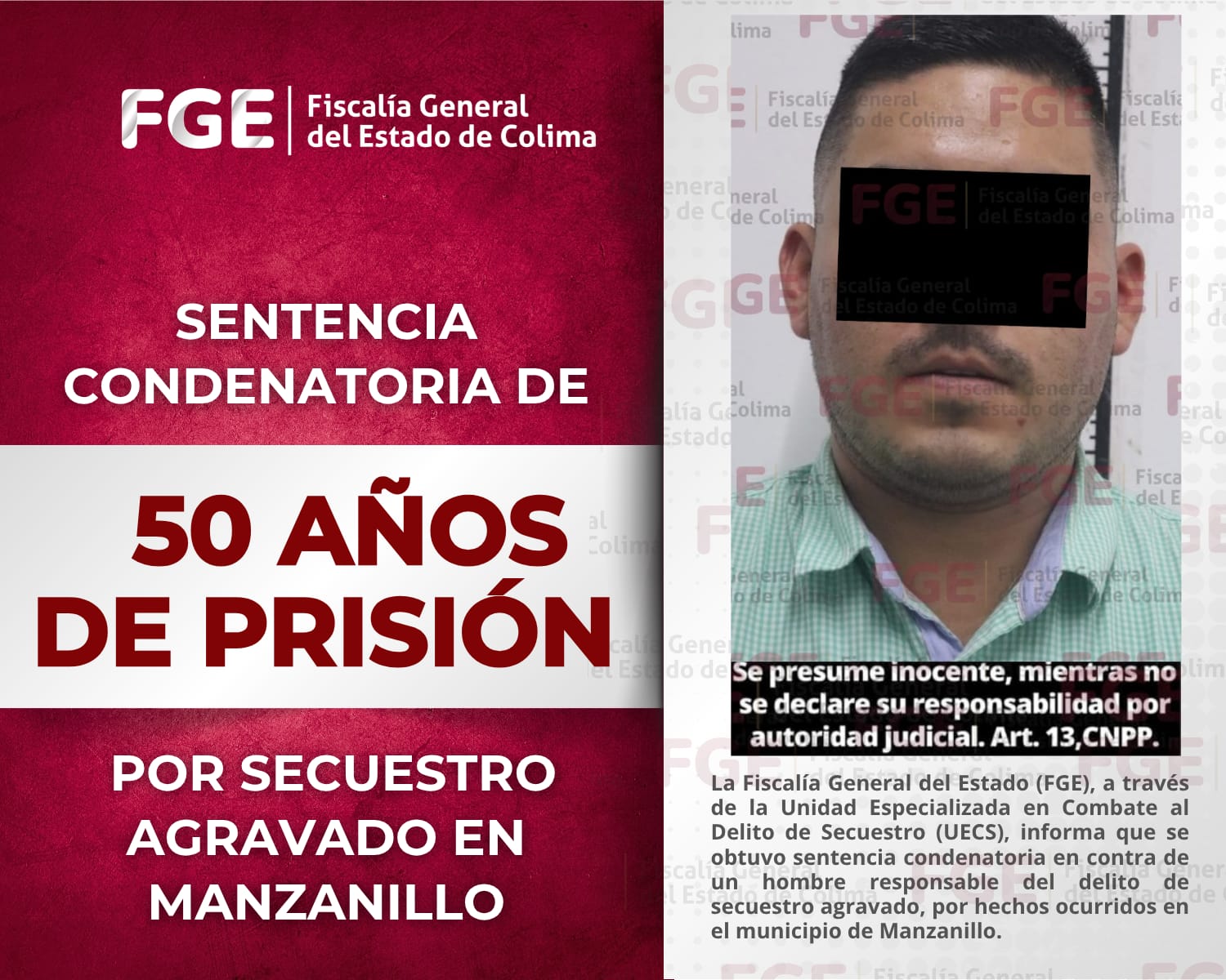 COLIMA.- La Fiscalía General del Estado (FGE), a través de la Unidad Especializada en Combate al Delito de Secuestro (UECS), informa que se obtuvo sentencia condenatoria en contra de un hombre responsable del delito de secuestro agravado, por hechos ocurridos en el municipio de Manzanillo.