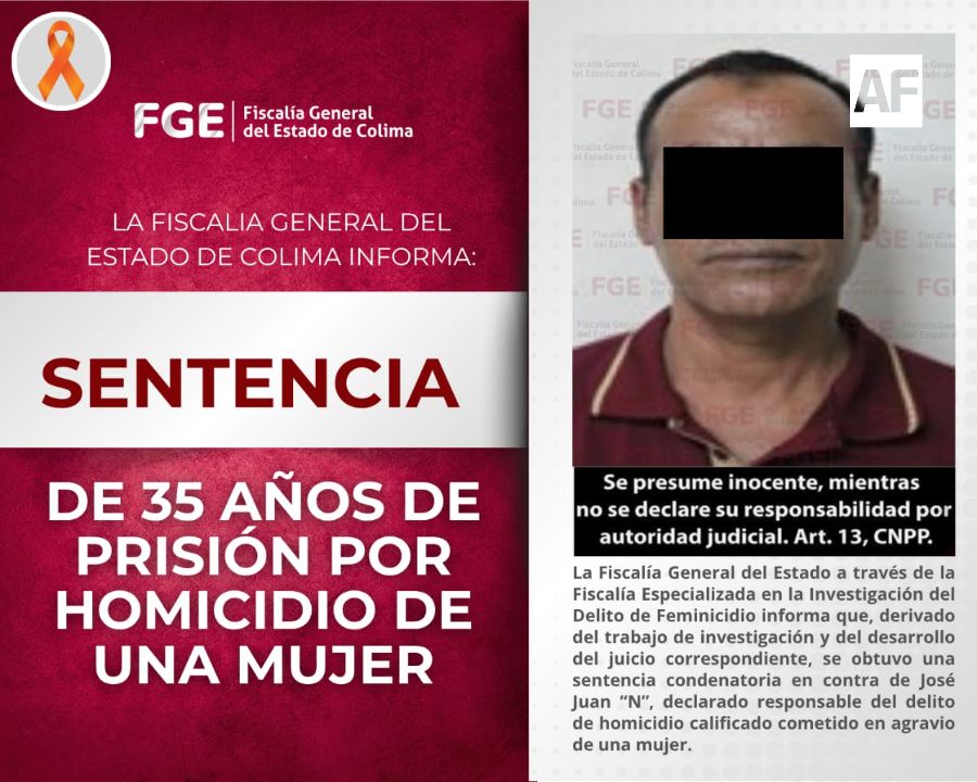 Colima.- La Fiscalía General del Estado a través de la Fiscalía Especializada en la Investigación del Delito de Feminicidio informa que, derivado del trabajo de investigación y del desarrollo del juicio correspondiente, se obtuvo una sentencia condenatoria en contra de José Juan “N”, declarado responsable del delito de homicidio calificado cometido en agravio de una mujer.