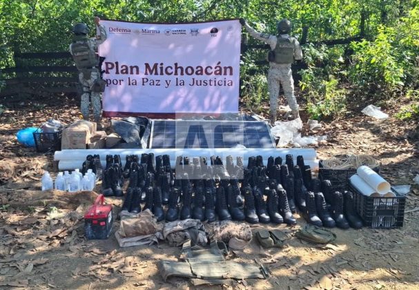 En el lugar también se decomisaron dos vehículos y una motocicleta, además de diverso equipo táctico, entre ello dos uniformes tipo militar, un chaleco táctico, 42 pares de botas, una batería, 15 soluciones Harman y un panel solar.